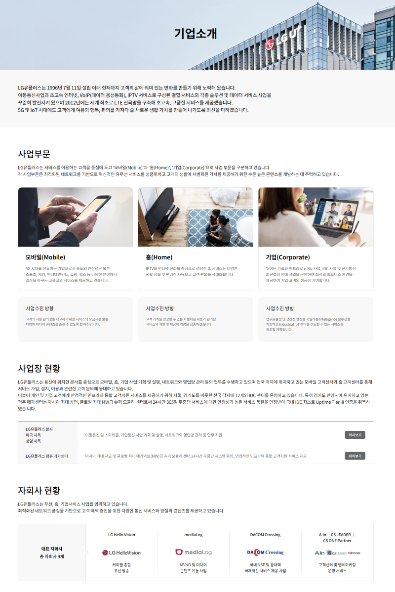 유플러스는 대한민국 대표 통신 기업으로, 단순히 통신 서비스를 제공하는 것을 넘어 AI, 빅데이터, 클라우드 등 미래 기술을 선도하며 고객 경험 혁신을 주도하고 있습니다. 특히, 5G 통신망을 기반으로 한 다양한 사업 분야에서 두각을 나타내고 있으며, 미디어, 엔터테인먼트, 스마트홈 등 우리의 일상과 밀접한 서비스를 제공하며 삶의 질을 향상시키는 데 기여하고 있습니다.