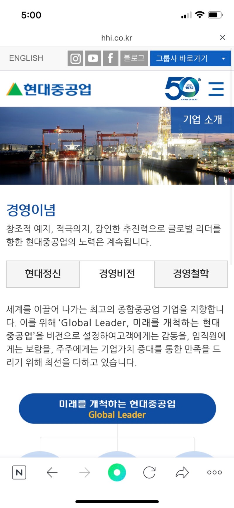 현대중공업 핵심가치: 도전, 혁신, 신뢰, 상생
