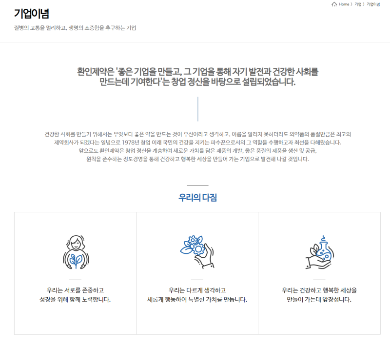 환인제약 분석 자료 (핵심 가치, 비전, 인재상)