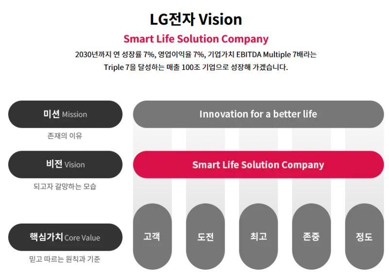 핵심 가치: 고객의 삶을 풍요롭게 만드는 기술, 인간 중심의 디자인, 지속 가능한 미래